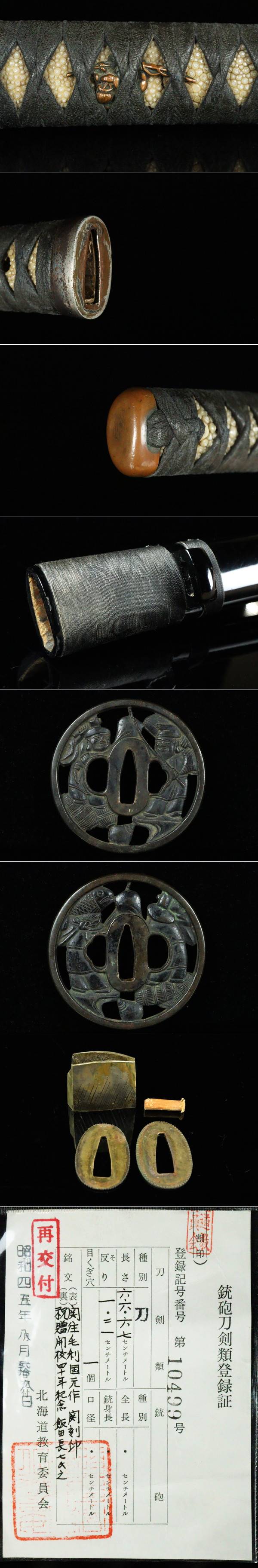 > 【ASAHI】関住毛利国元作 関刻印 祝贈 開校四十年記念 飯田長七氏之 互の目刃文 恵比寿大黒図鍔 刀剣武具[79173qyt]