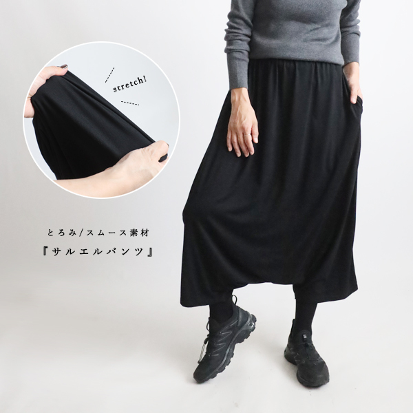 - 秋のパンツ祭り 90cm スムース伸縮ストレッチ Tシャツ カットソー生地 誰にでも似合うサルエル パンツ 黒 K35