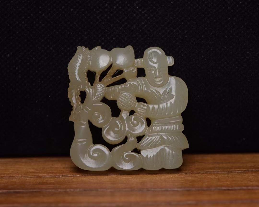 - 【超珍館蔵】和田玉製 細密彫 鏤空彫 童子獻壽 置物 賞物 古賞物 古董品 古美術品 時代物 旧家蔵出 稀少珍蔵品