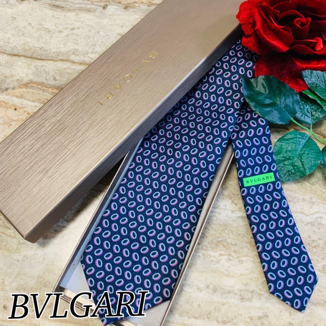 - N52 美品 ブルガリ セッテピエゲ 総柄 リング柄 ネイビー ネクタイ メンズ