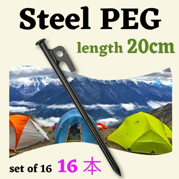 - 送料無料 スチールペグ ペグ スチール製 16本 20cm 高強度 引抜穴付きペグ テント タープ 設営 キャンプ DIY BBQ 野外フェス バーベキュー