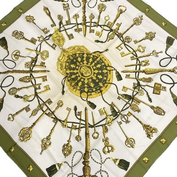 - エルメス HERMES カレ90 白×カーキ×ダークイエロー スカーフ
