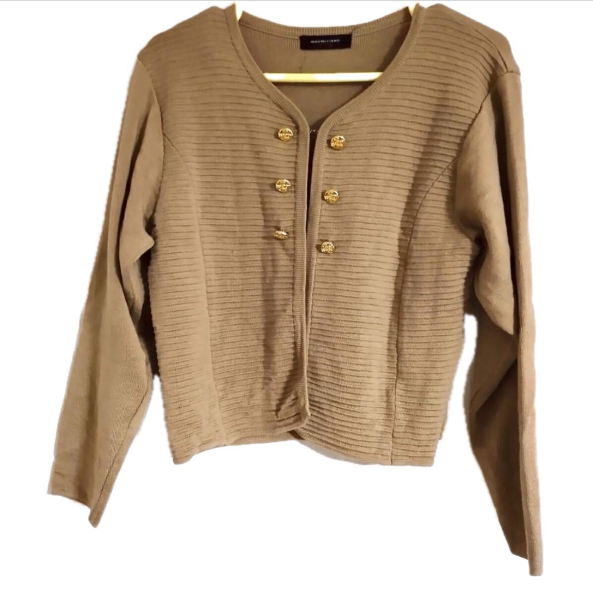 > 無地ベージュ長袖ジャケットカーディガン クルーネック 金ボタン キャメルブラウントップス ノーカラージャケット ニットジャケット 日本製