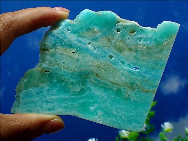 白や、灰色、褐色などの色をもった石ですが、一般的に良く見られるものは明るい空の色、南国の海の色に例えられるたいへん鮮やかなブルーが美しい石です。古くから悪霊を祓う力のある石として、珍重されてきました。