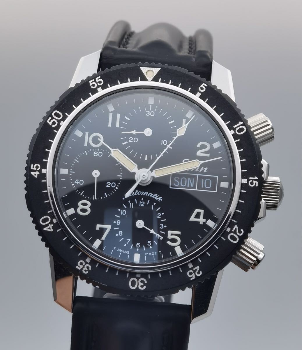 - 中古 ジン SINN パイロット 103.B.SA.AUTO クロノグラフ デイデイト 黒 ブラック文字盤 SS メンズ 自動巻き 腕時計