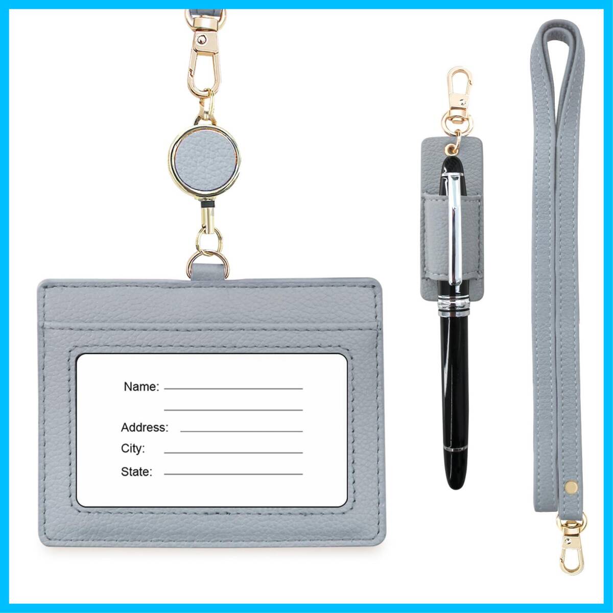 - ネックストラップ付き 首掛け 定期入れ おしゃれ リール付き ネームホルダー 社員証ケース 2枚 横型 両面 革 名刺入れ 名札