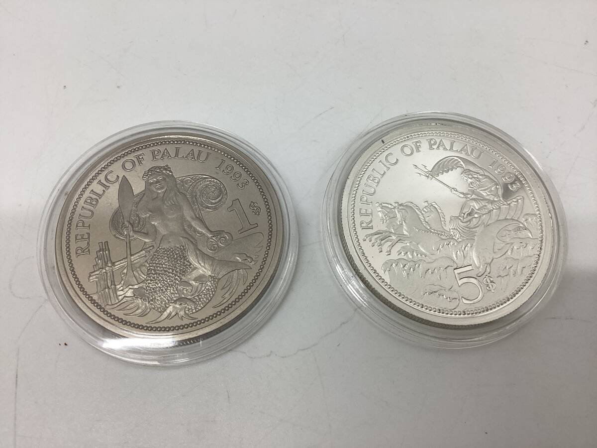> 【7816AB】パラオ 共和国 カラーコイン 2枚 1993年 ネプチューン 5ドル 銀貨 マーメイド 1ドル 白銅貨 REPUBLIC OF PALAU 硬貨