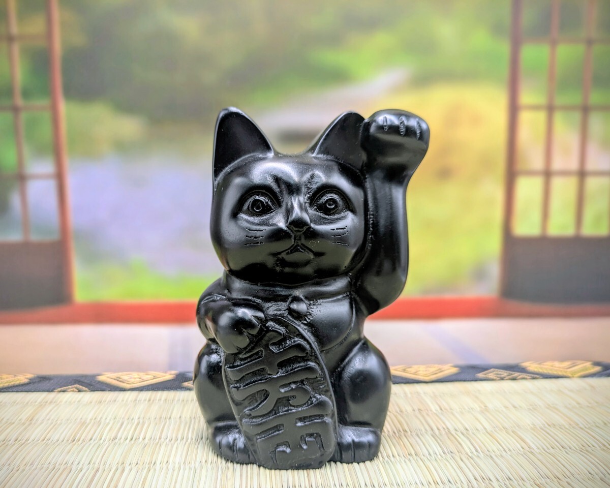 - 縁起物 招き猫 那智黒石 左手上げ 大 手磨き工芸品