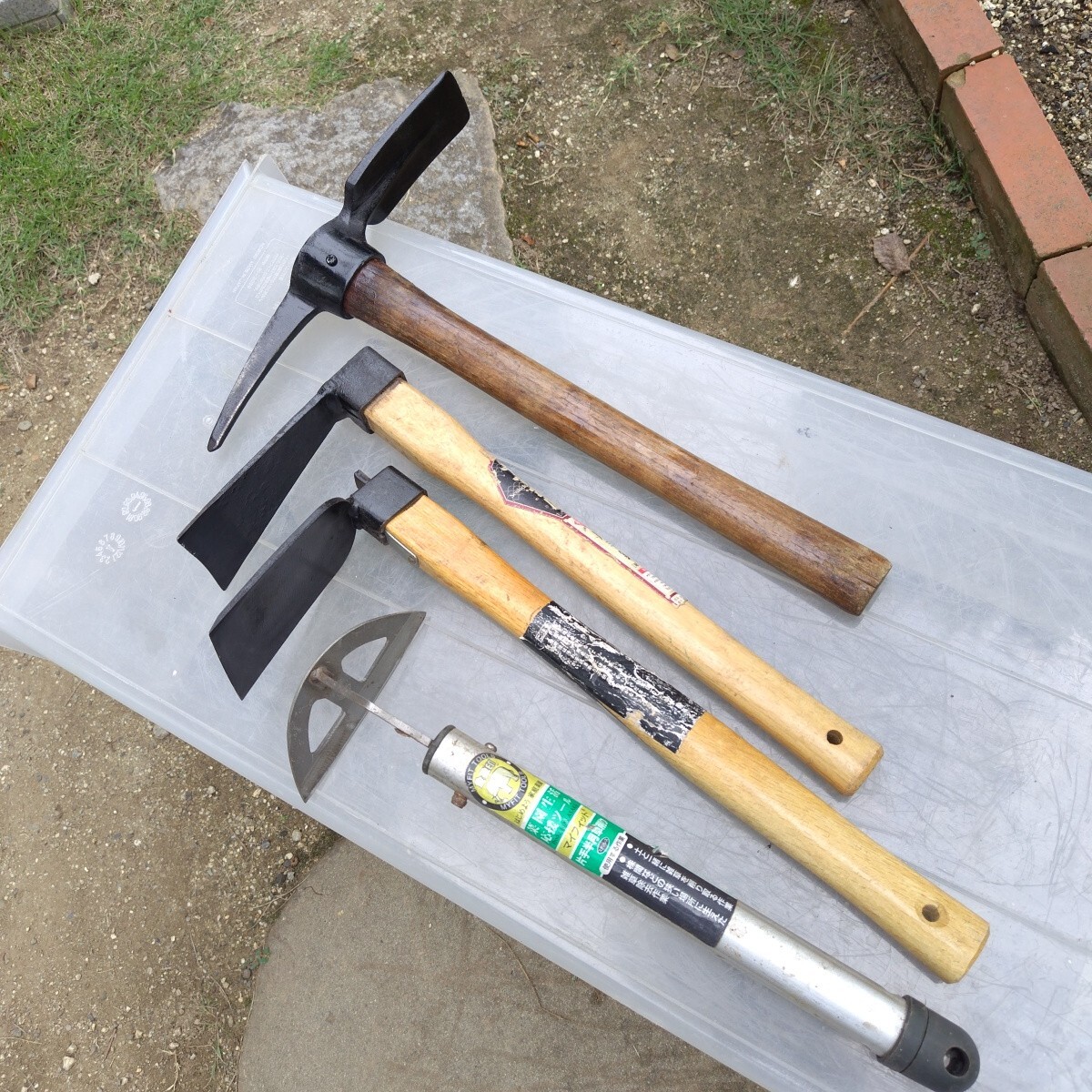 - 片手鍬3本 小型ツルハシ1 大工道具 家庭菜園用 畑仕事用 アウトドアキャンプ用 (中古)