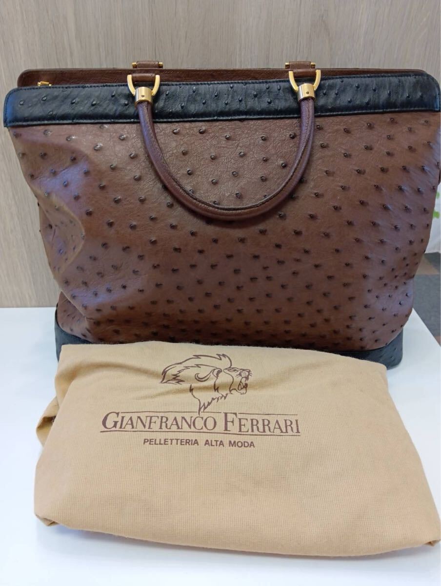 > 【中古品】GIANFRANCO FERRARIジャンフランコフェラーリ オーストリッチ バイカラー ハンドバッグ 茶ブラウン×黒ブラック保存袋付き現状品