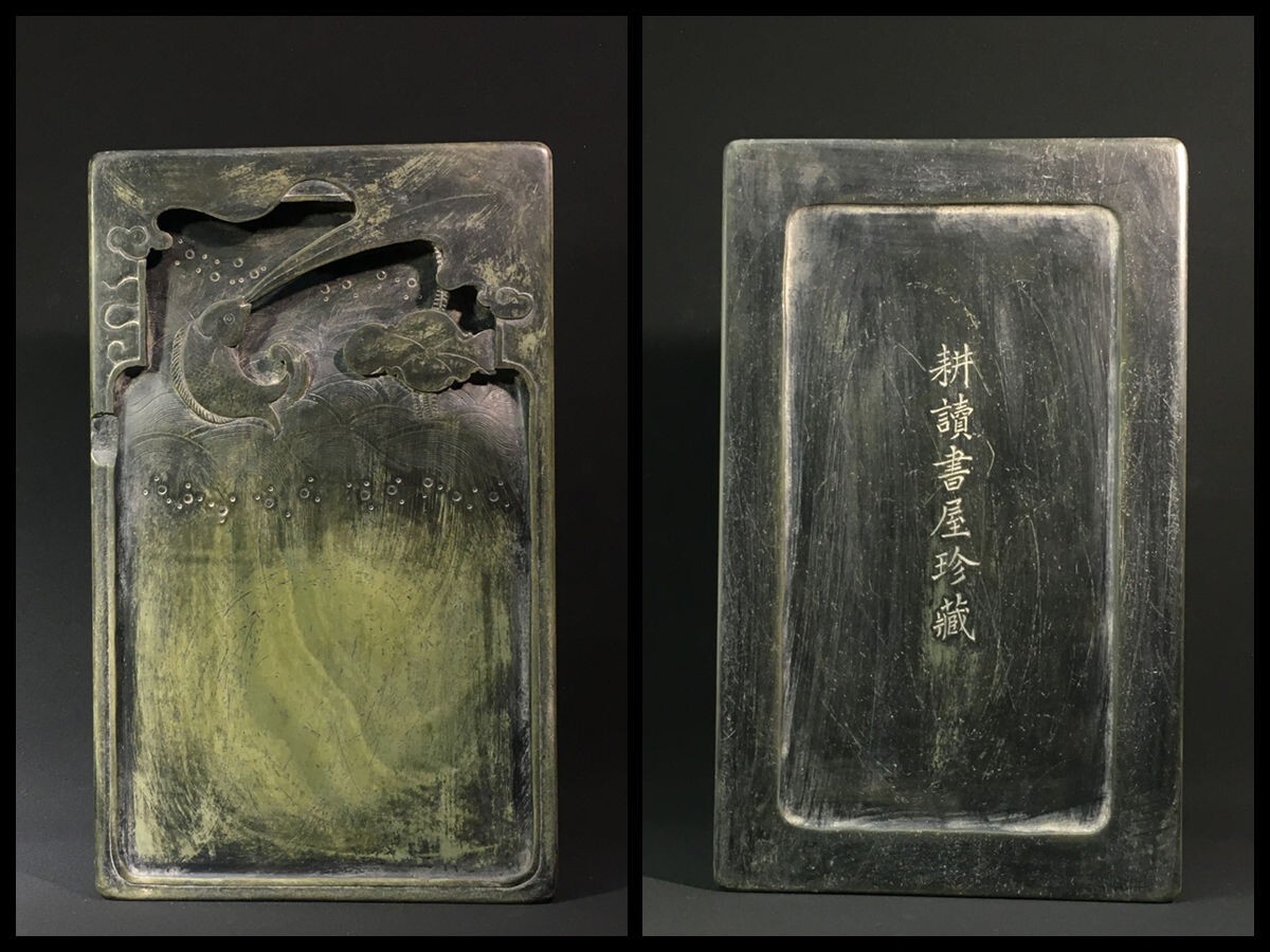 - 「松花石硯 蓮蓮有魚文房端渓硯 耕讀書屋珍藏銘 清時代」手彫り 文房四宝 書道具 中国古美術 旧蔵出