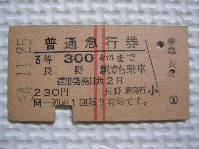 - 【硬券A型縦2条赤線普通急行券】昭和34年 3等300kmまで 長野駅から乗車 230円 長野駅発行