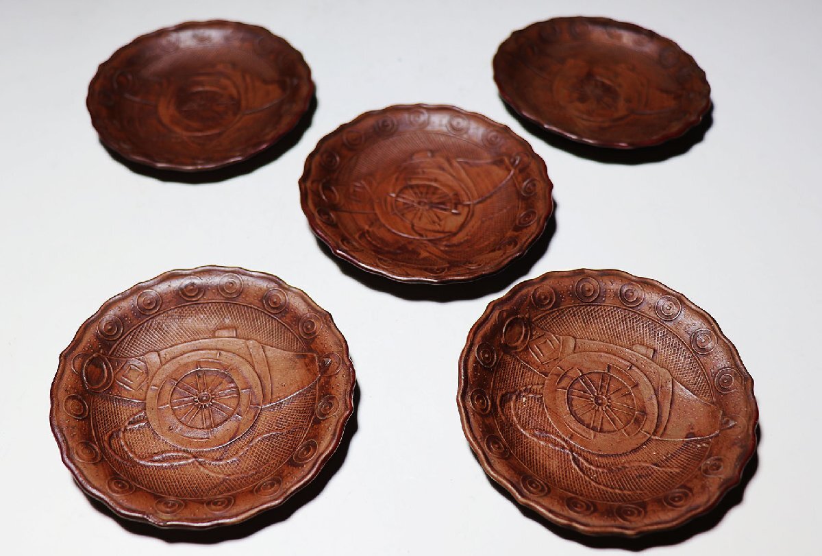 - 【桃】備前焼型押し陽刻大砲図皿 五客