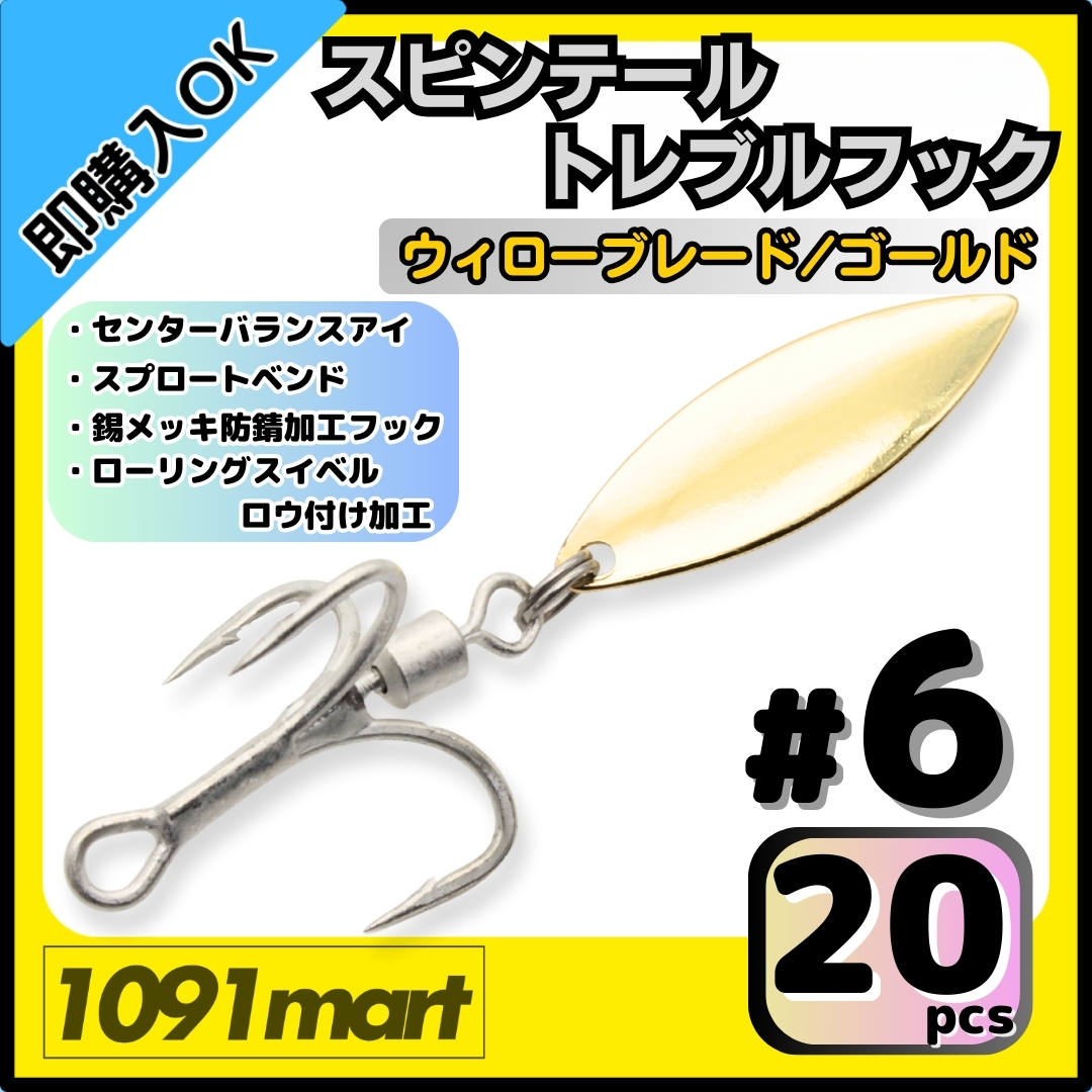 - 【送料無料】スピンテール トレブルフック ウィローブレード ゴールド #6 20個セット ロウ付けスイベル ルアーのブレードチューンに!