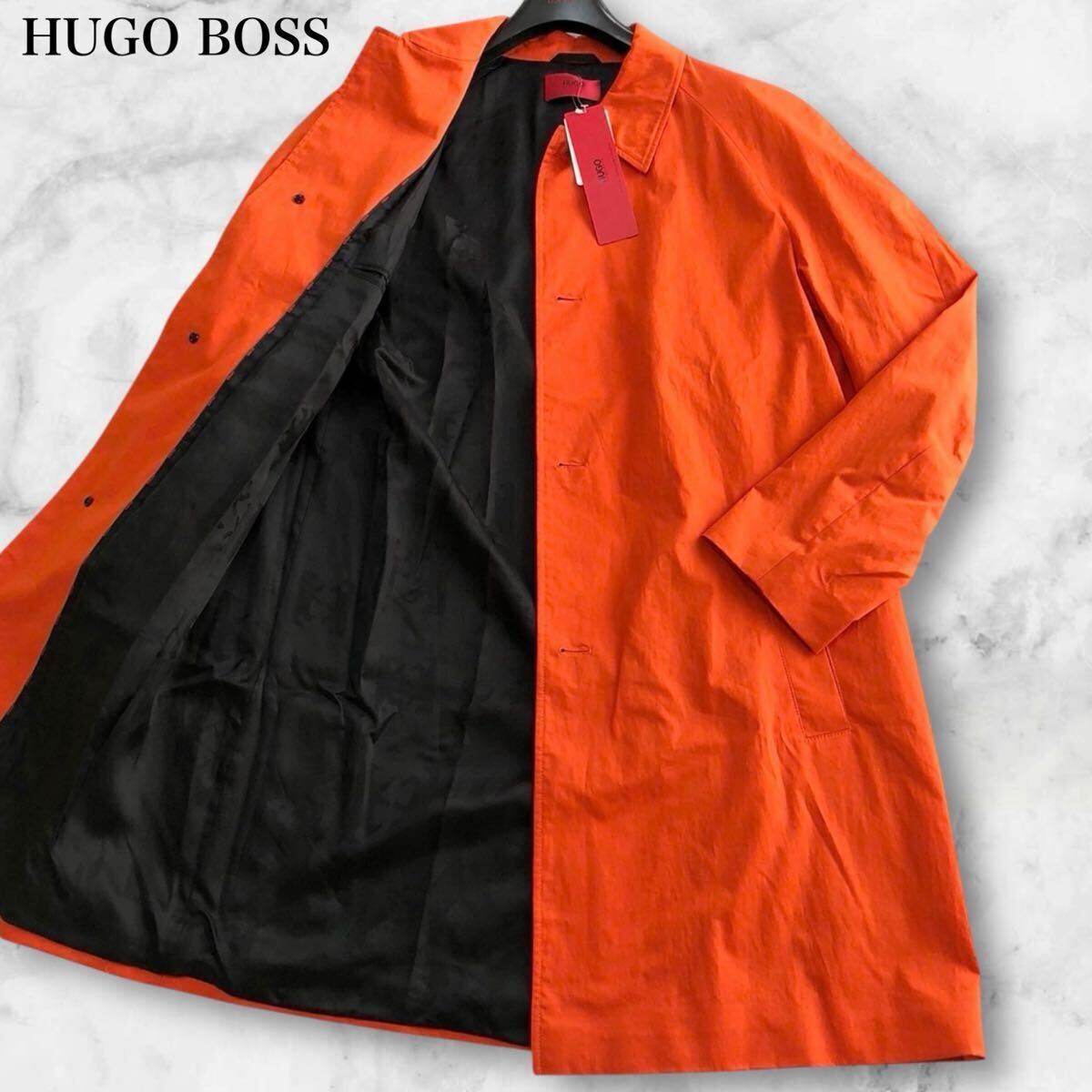 > 未使用タグ付き●HUGO BOSS ヒューゴボス 赤タグ ステンカラーコート ロング アウター オレンジ 撥水加工 メンズ ハンガー付き Lサイズ