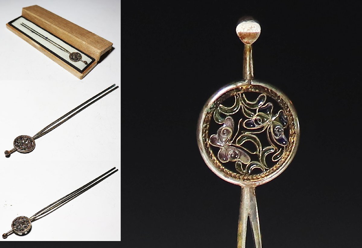 - 【桃】アンティーク髪飾り:金工銀製透かし彫七宝象嵌舞蝶簪