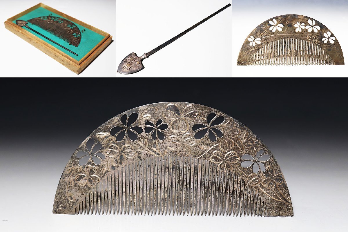 - 【桃】アンティーク髪飾り:純銀透かし彫クローバー紋様鏃櫛笄