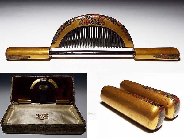 - 【桃】アンティーク髪飾り:金蒔絵赤漆絵花の図櫛笄