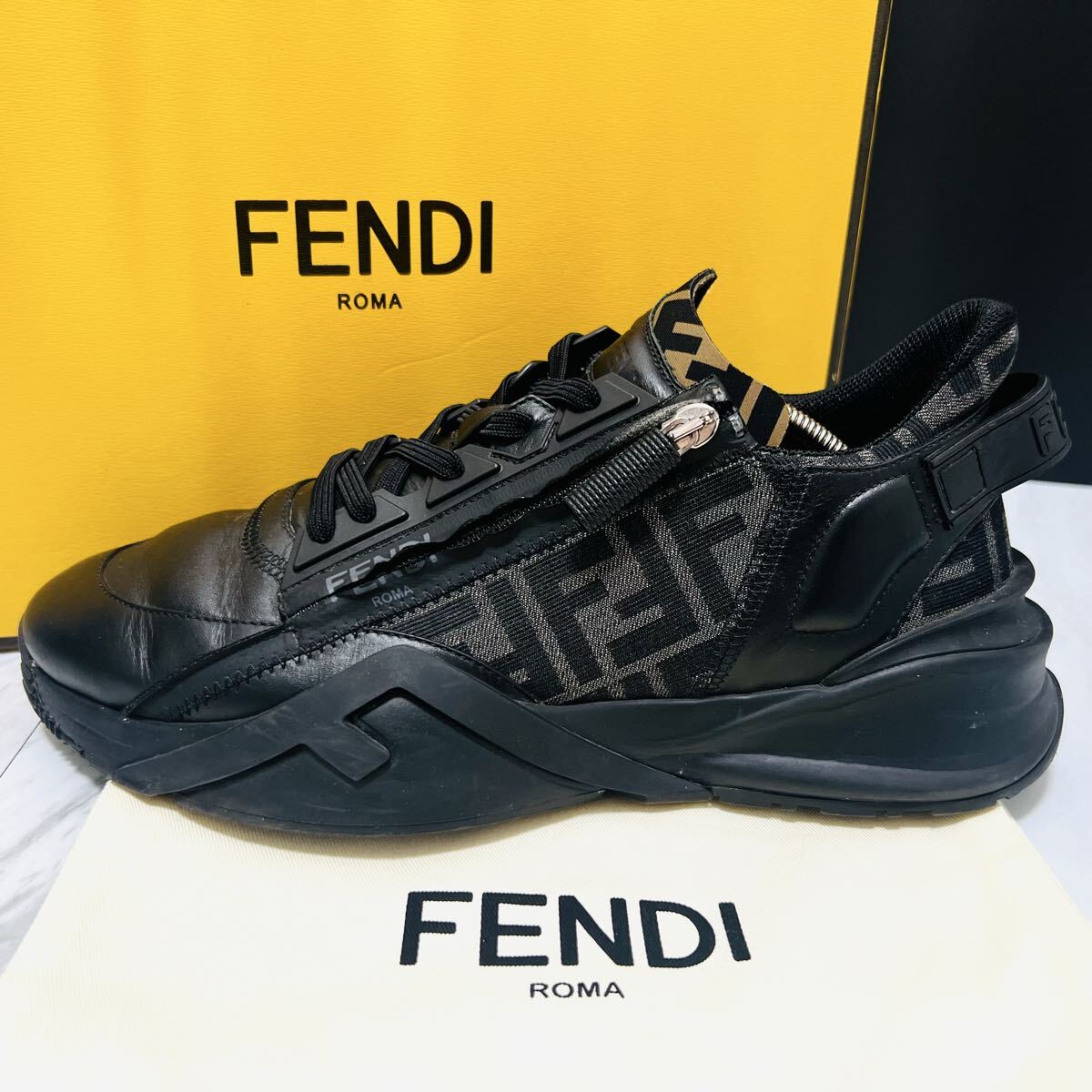 - 1円 【美品】 FENDI FLOW フェンディ フロー 【至高の逸品】 ファブリック ズッカ FF柄 厚底 ダッド スニーカー シューズ 靴 黒 26cm相当