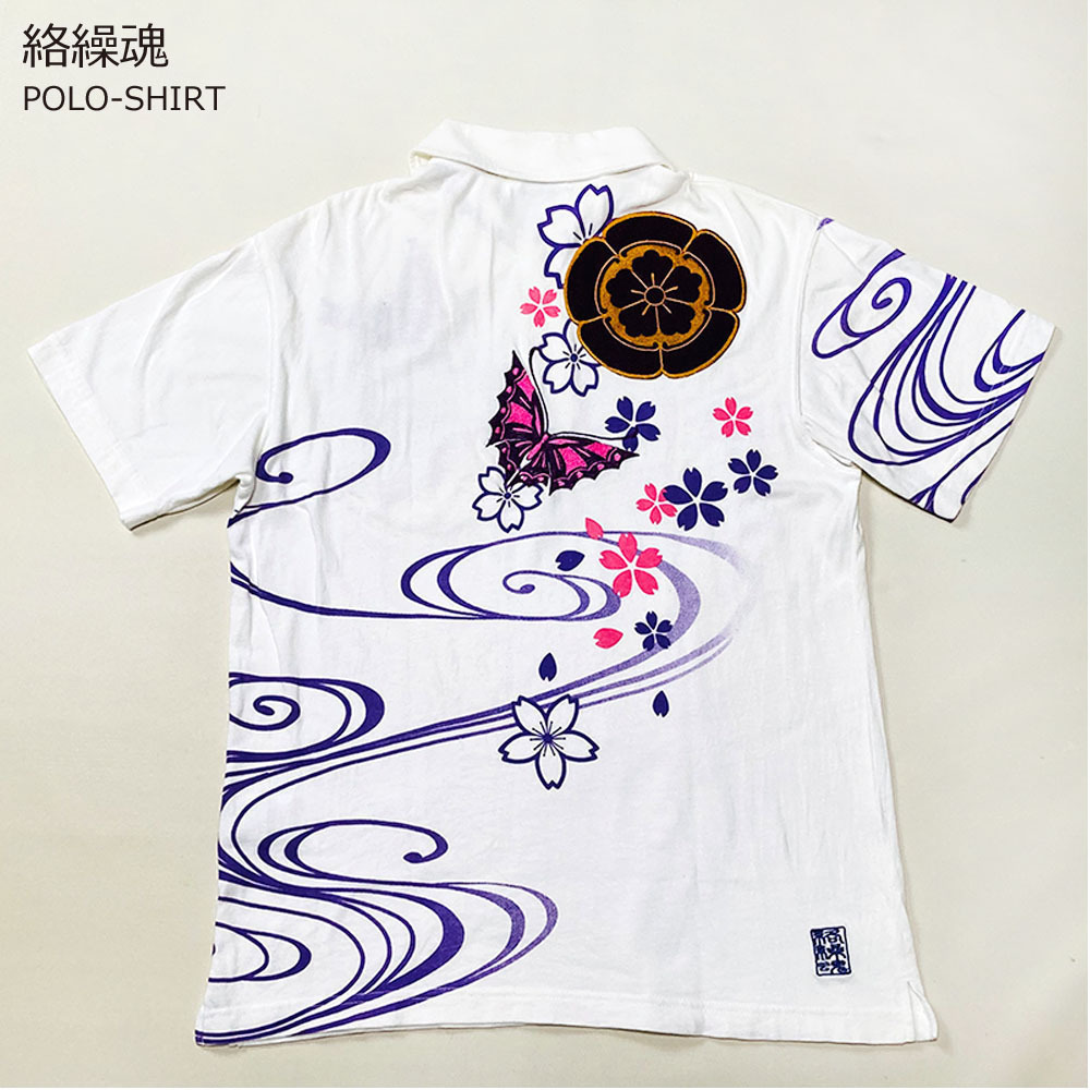 - 絡繰魂 半袖ポロシャツ メンズ M 和柄 蝶々 刺繍 和柄 プリント