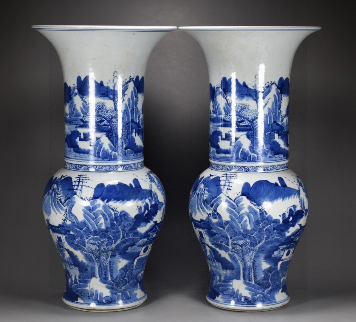 - 『館蔵珍品 清 康熙年製款 古陶瓷品 青花 山水人物紋 鳳尾瓶一對 陶芸』稀少珍蔵品 古賞物 貴重物品 収蔵品 中国古美術 時代物 古董品