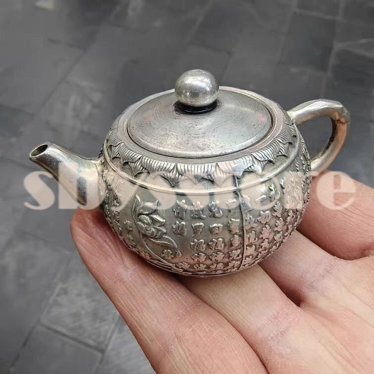 - 極上の逸品 古玩銅器コレクション アンティーク風 銀メッキ 般若波羅蜜経 小さな茶壺 酒壺 インテリア 茶道 工芸置物