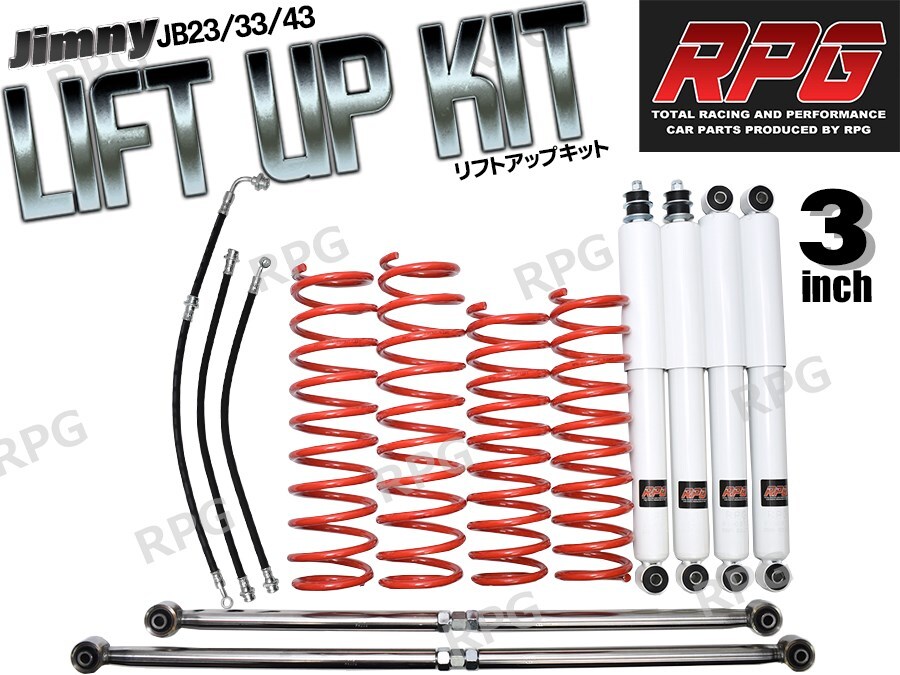 > ジムニー JB23/JB33/JB43 3インチ リフトアップキット RPGロングショック白 ステンラテ コイル赤 50mmロングブレーキホース付