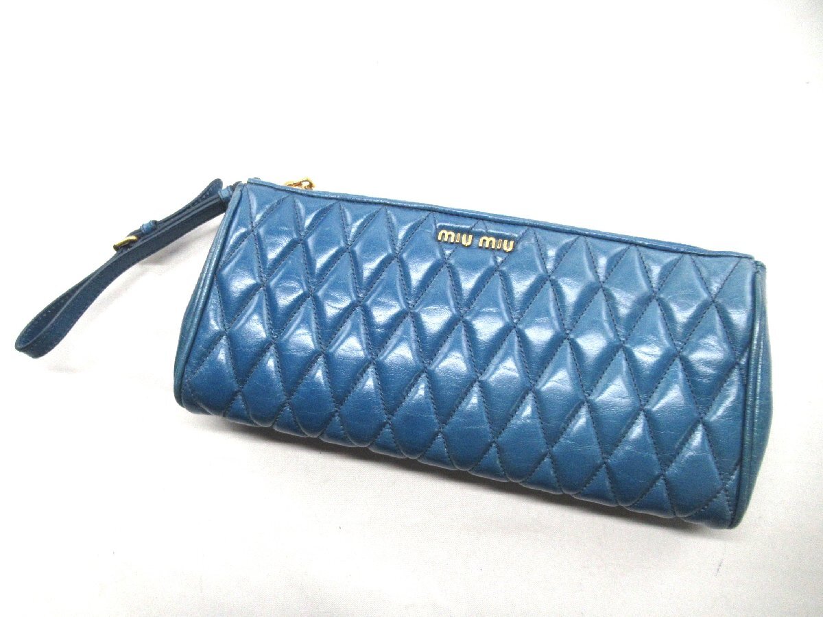 - ★【B送900円】2538 miu miu ミュウミュウ マテラッセ クラッチバッグ キルティング ブルー レザー ゴールド金具 カード付