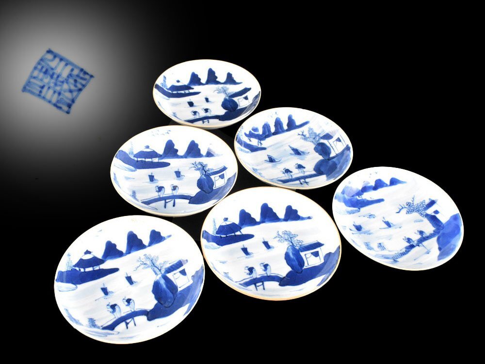 - 【雲】某名家収蔵品 中国 染付人物山水風景図小皿 6客 直径10.5cm 古美術品(芙蓉銘々皿懐石料理道具)BY5324 OTyso8