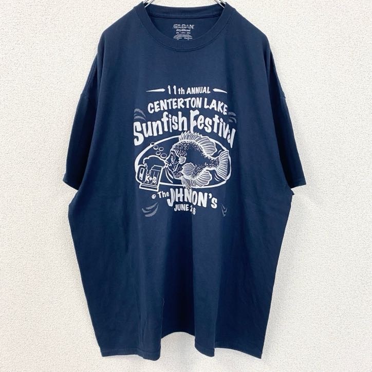 - 古着 used GILDAN ギルダン 半袖プリントTシャツ 魚 クルーネック レトロデザイン 紺 ネイビー XXLサイズ
