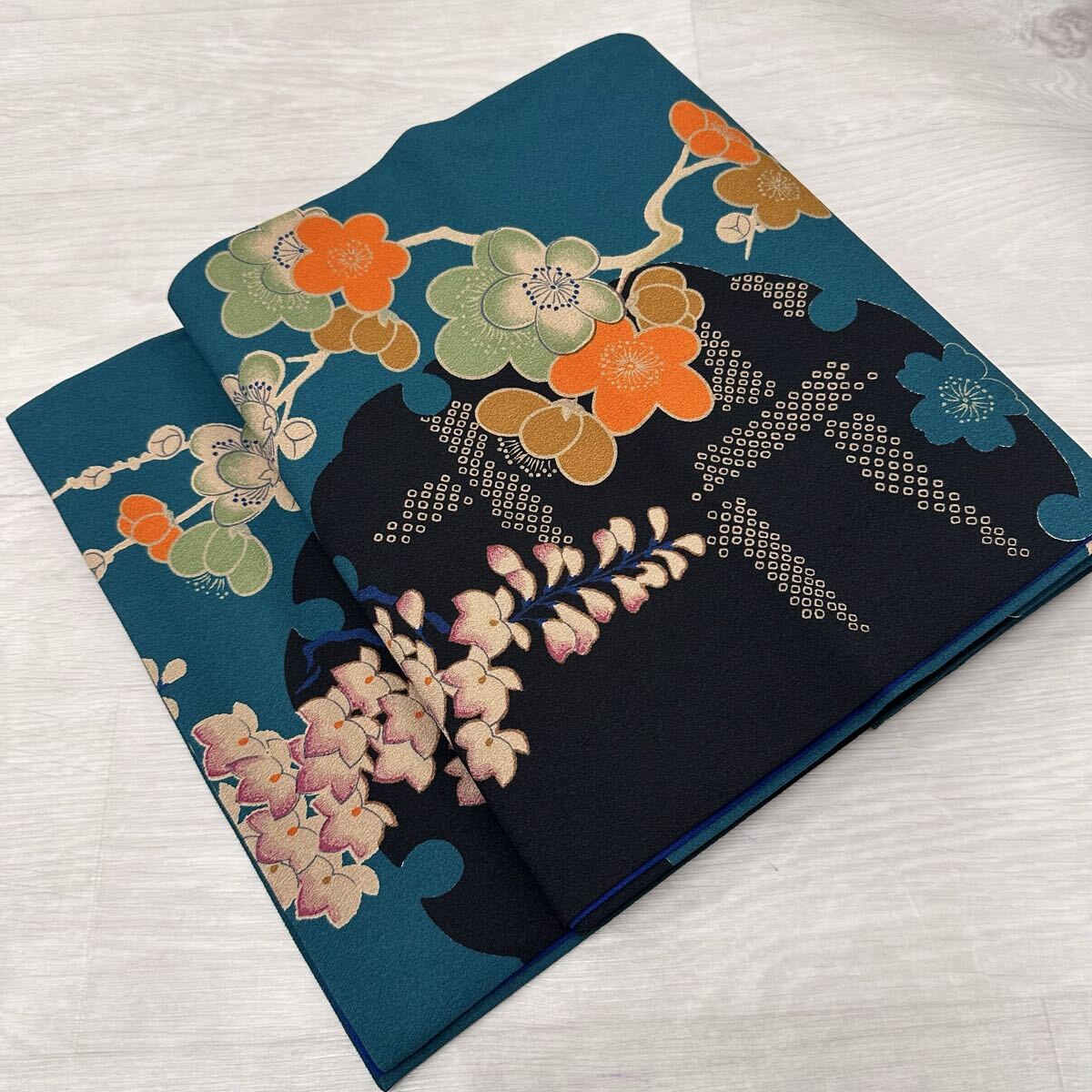 - 京袋帯 雪輪 梅に藤の花 素敵な色味 化繊 着物 Q-009