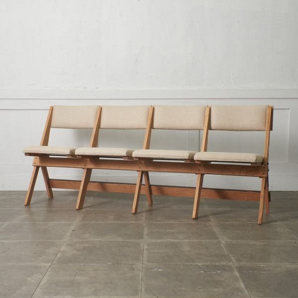 - IZ83374N★張替済 レア 英国 アンティーク 4連 シネマベンチ ストリップド 加工 折りたたみ 椅子 フォールディング チェア 長椅子 イギリス