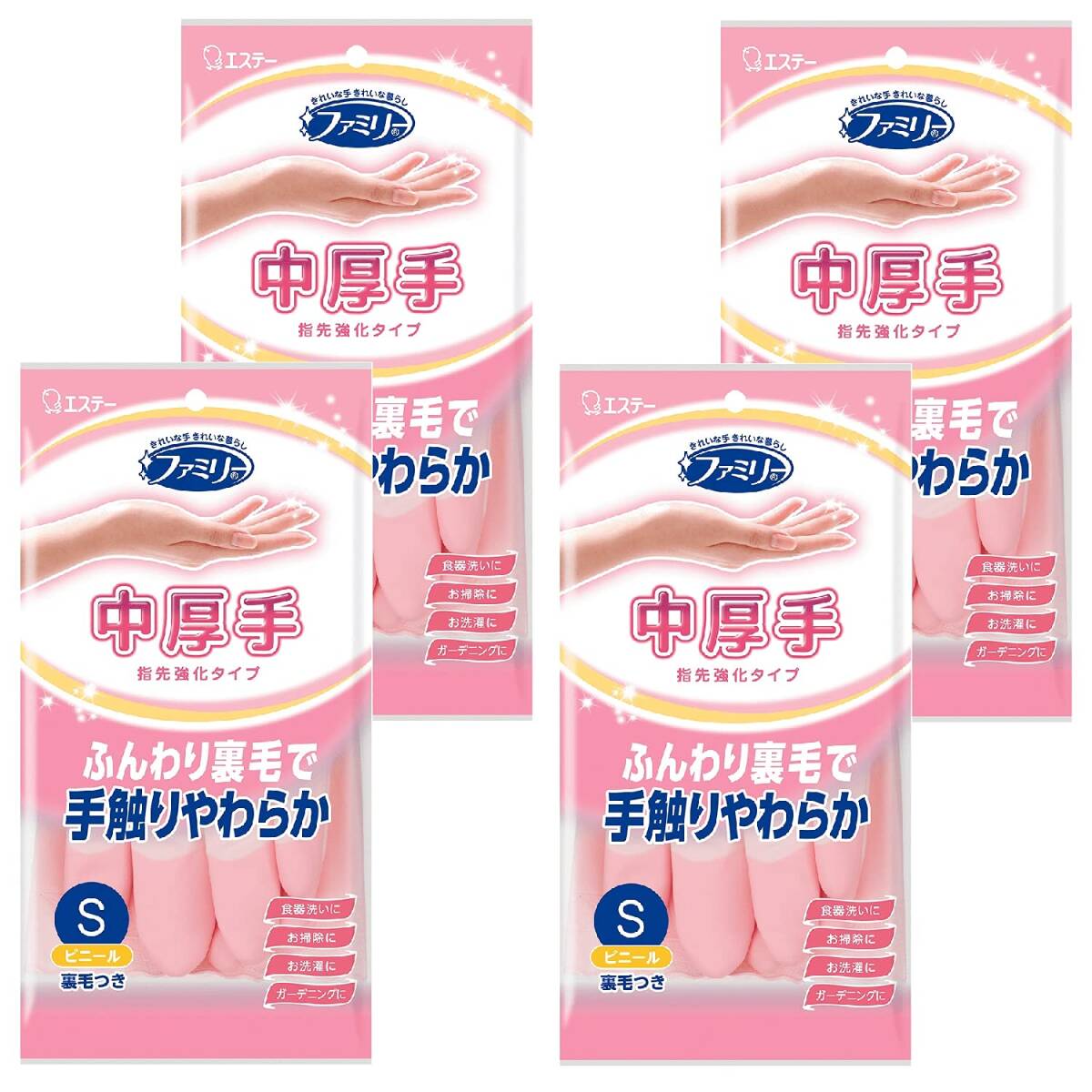 > ファミリー [まとめ買い] 家庭用手袋 ビニール 手袋 中厚手 指先強化 Sサイズ ピンク×4個 キッチン 食器洗い 掃除 洗濯 ガーデニング