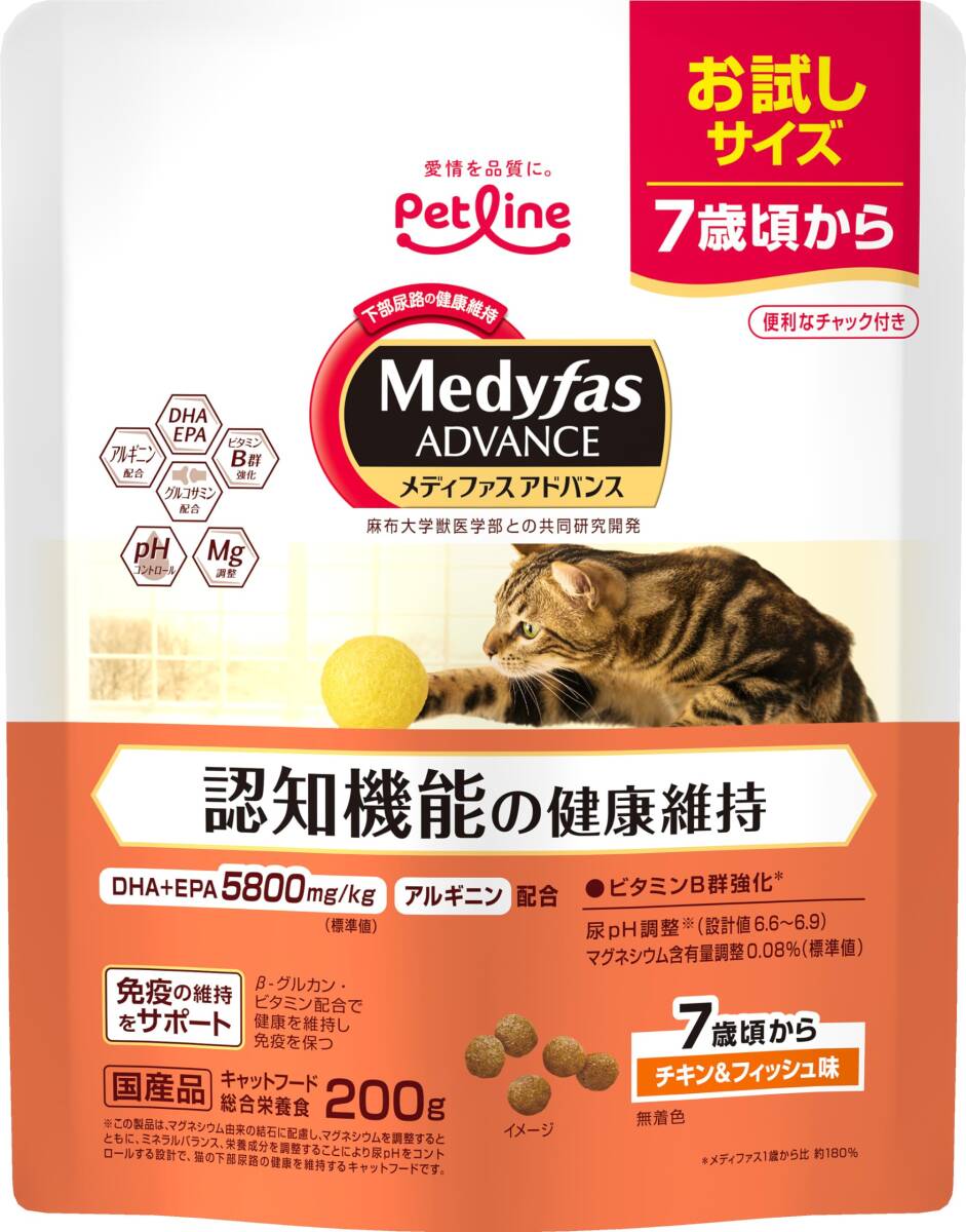 > メディファスアドバンス キャットフード 認知機能の健康維持 7歳頃から チキン&フィッシュ味 【下部尿路/国産/お試し】200g