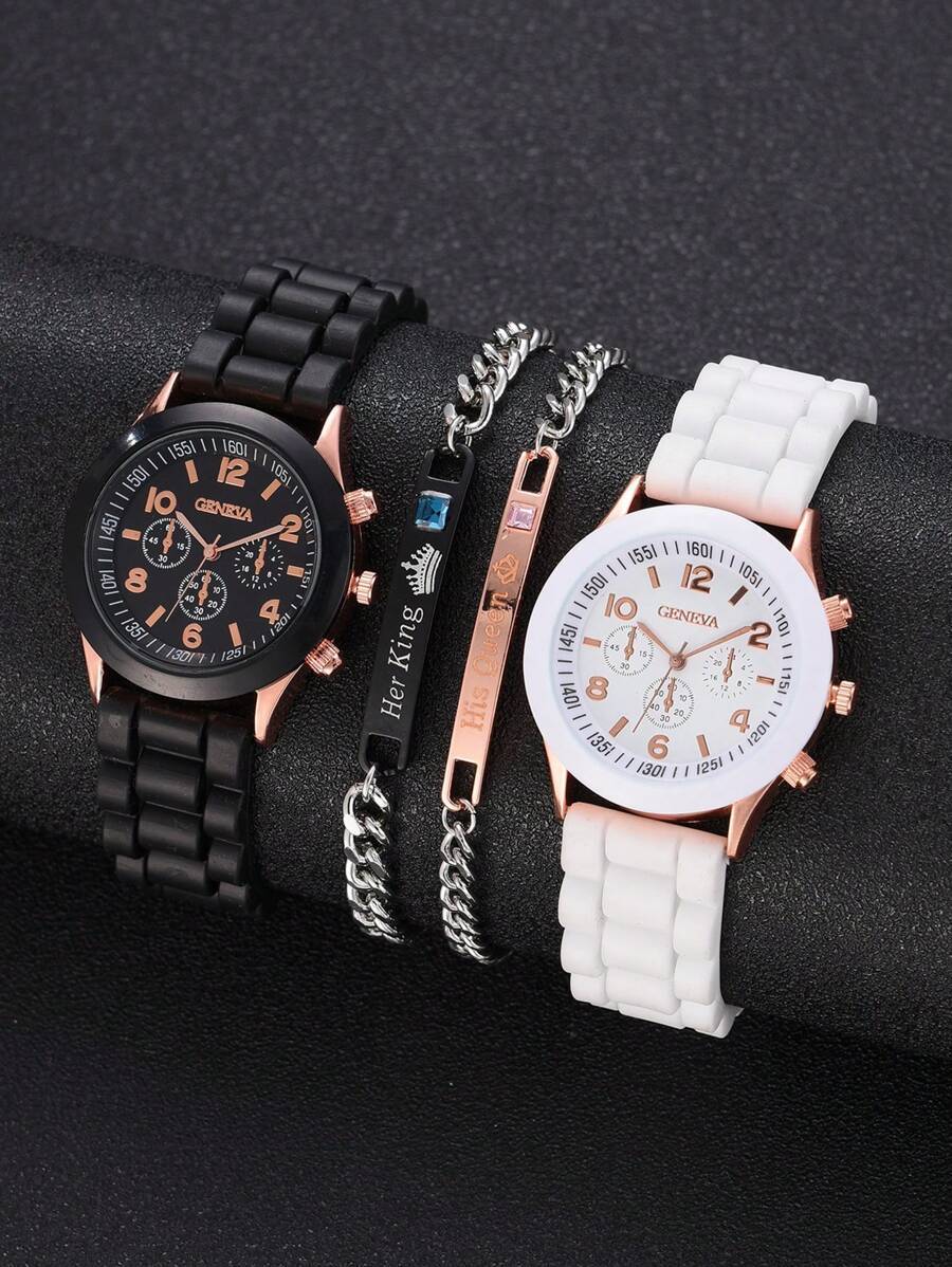 - 腕時計 ペアウォッチ 4個セット ジェネバ カップルウォッチ 黒白 シリコン バンド メタルチェーン ブレスレット付き
