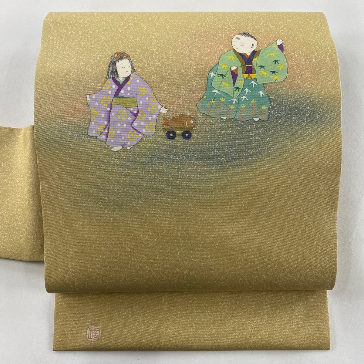 > 【美品】 名古屋帯 秀品 落款 童 玩具 からし色 正絹 【中古】