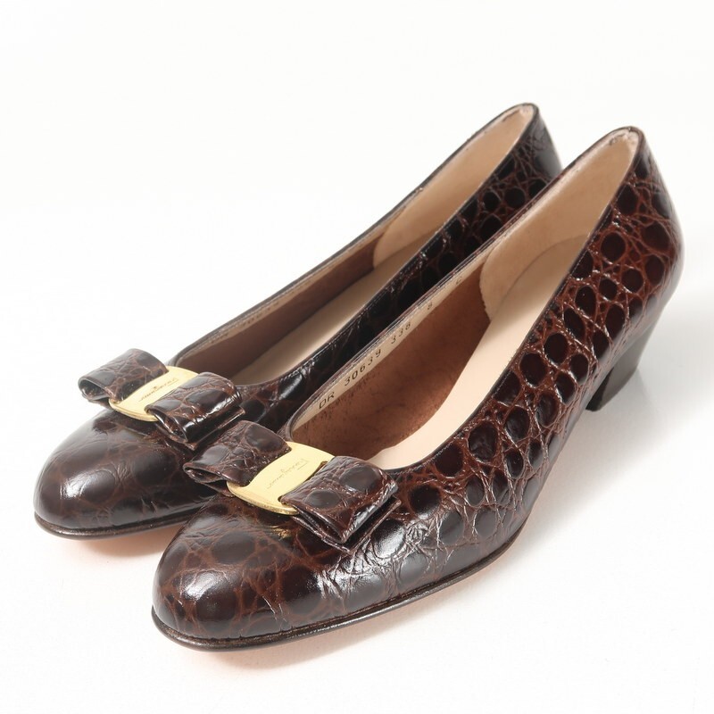 - GS3356*未使用 サルヴァトーレフェラガモ Size 8C VARA ヴァラリボン クロコ型押しレザー パンプス 靴 ブラウン Salvatore Ferragamo