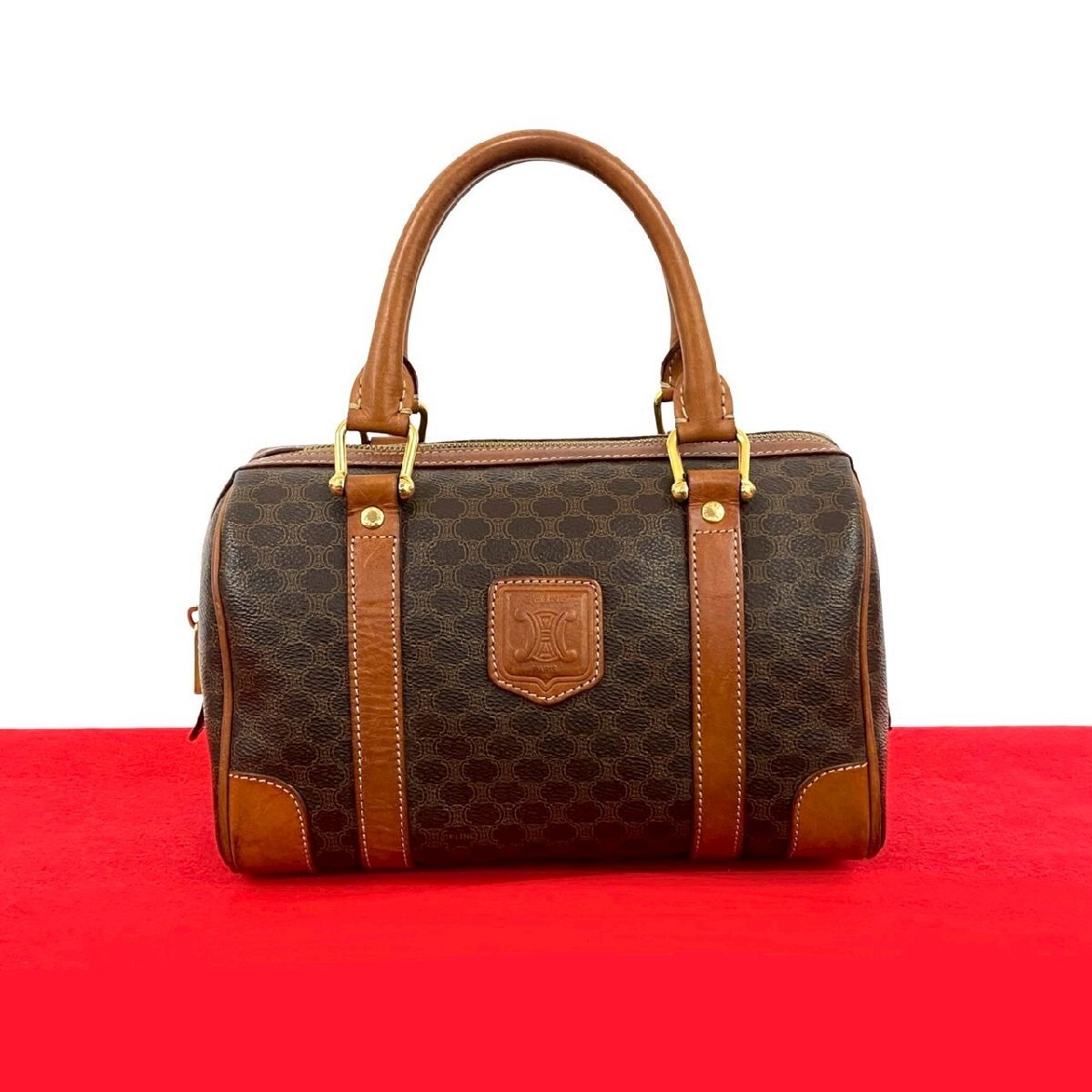 - 極 美品 CELINE セリーヌ ヴィンテージ マカダム ブラゾン 柄 トリオンフ ロゴ レザー ハンドバッグ ミニ ボストンバッグ ブラウン 129-2