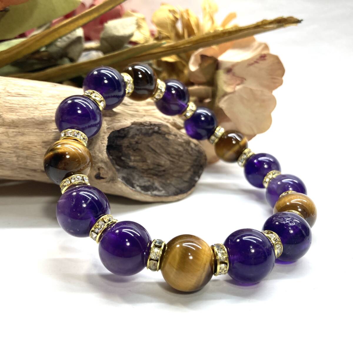 - タイガーアイ&アメジスト パワーストーン ブレスレット 天然石ブレス (ゴールド) 12mm 金運 仕事運 メンズ・レディース 男性 女性 幸運