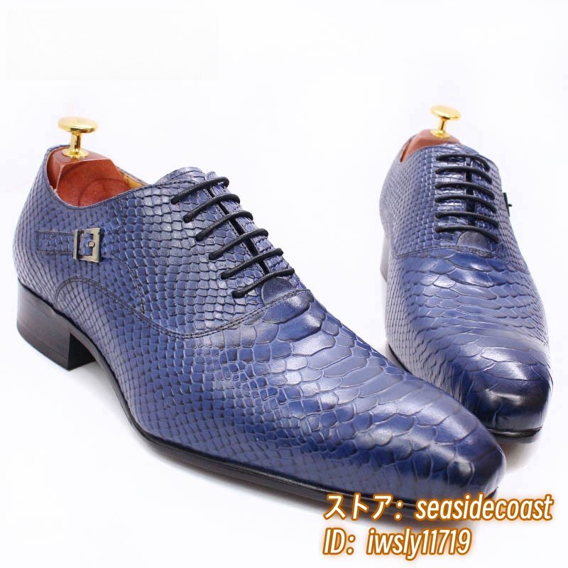 > 最高級★定価9万 ビジネスシューズ 本革 レザーシューズ 新品 紳士靴 超希少 蛇紋 職人手作り フォーマル 高級牛革 革靴 ブルー 27.5cm