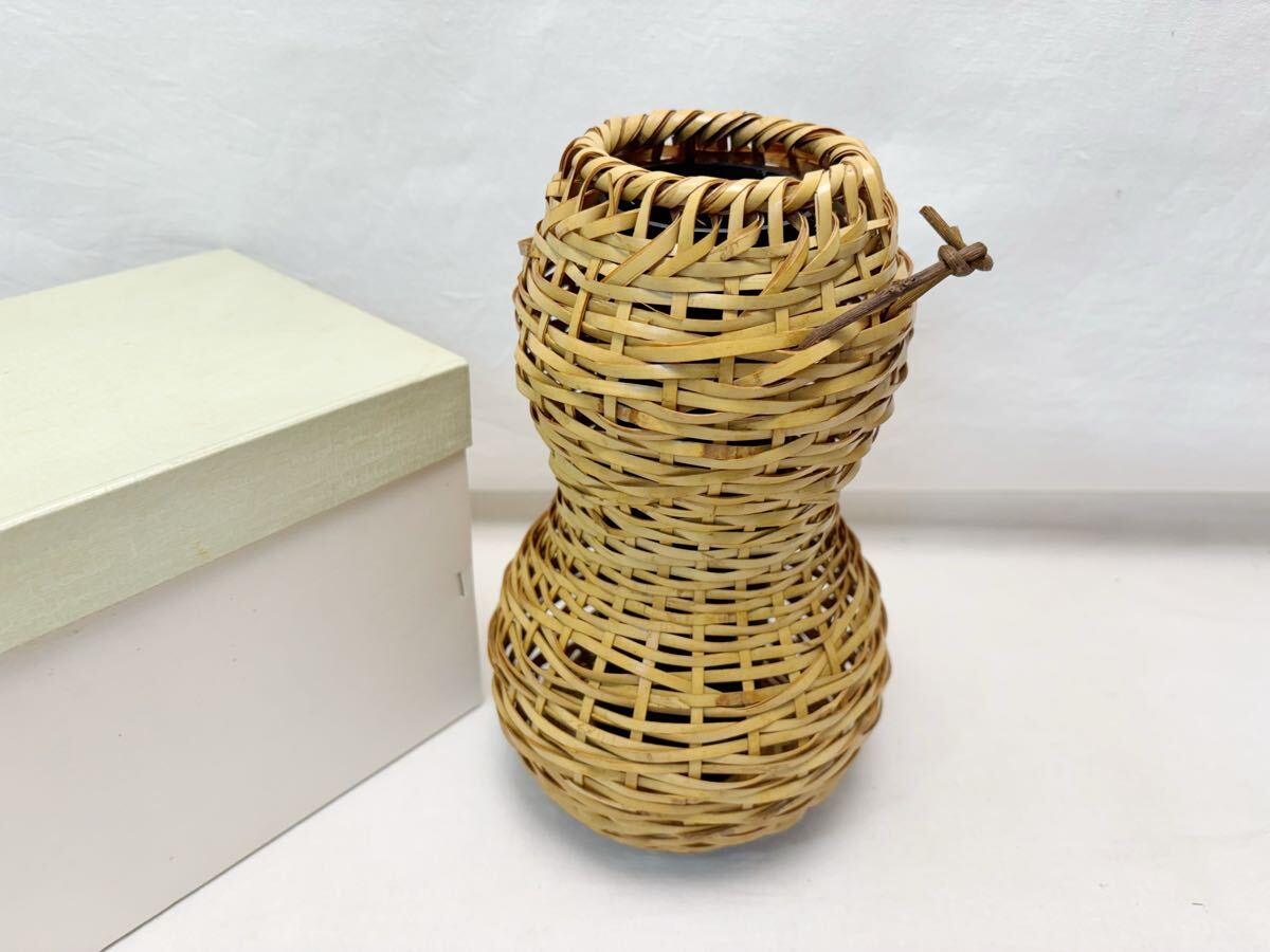 - M704023 未使用 華道具 白竹 瓢箪形 花入 ひさご 掛置兼用 おとし付き 和室 茶室 茶席 竹細工 竹編 花器 花篭 花入 竹篭 紙箱