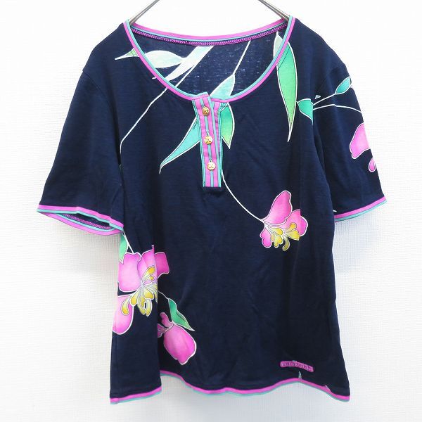◎商品名(タイトル):レオナール LEONARD カットソー トップス 花柄 総柄 金釦 [a958739]◎ブランド名:レオナール (LEONARD)◎アイテム名:カットソー トップス◎サイズ:◎性別:レディース◎カラー:紺系 ミックス◎素材:画像をご参照ください 判読できません◎実寸サイズ:肩幅約 40cm・袖丈約 21cm・着丈約 48.5cm・胸囲約 43cm×2◎商品コメント:★当店の商品はすべてリユースアイテムとなります。特質上、些細なダメージは記載しておりませんので着用に問題のない使用感、着古した雰囲気などはご了承下さいませ。◎コンディションレベル:目立った傷や汚れなし◎コンディション備考:-キーワード/アクイール/古着/used/ビンテージ/ヴィンテージ/昭和/レトロ/金ボタン