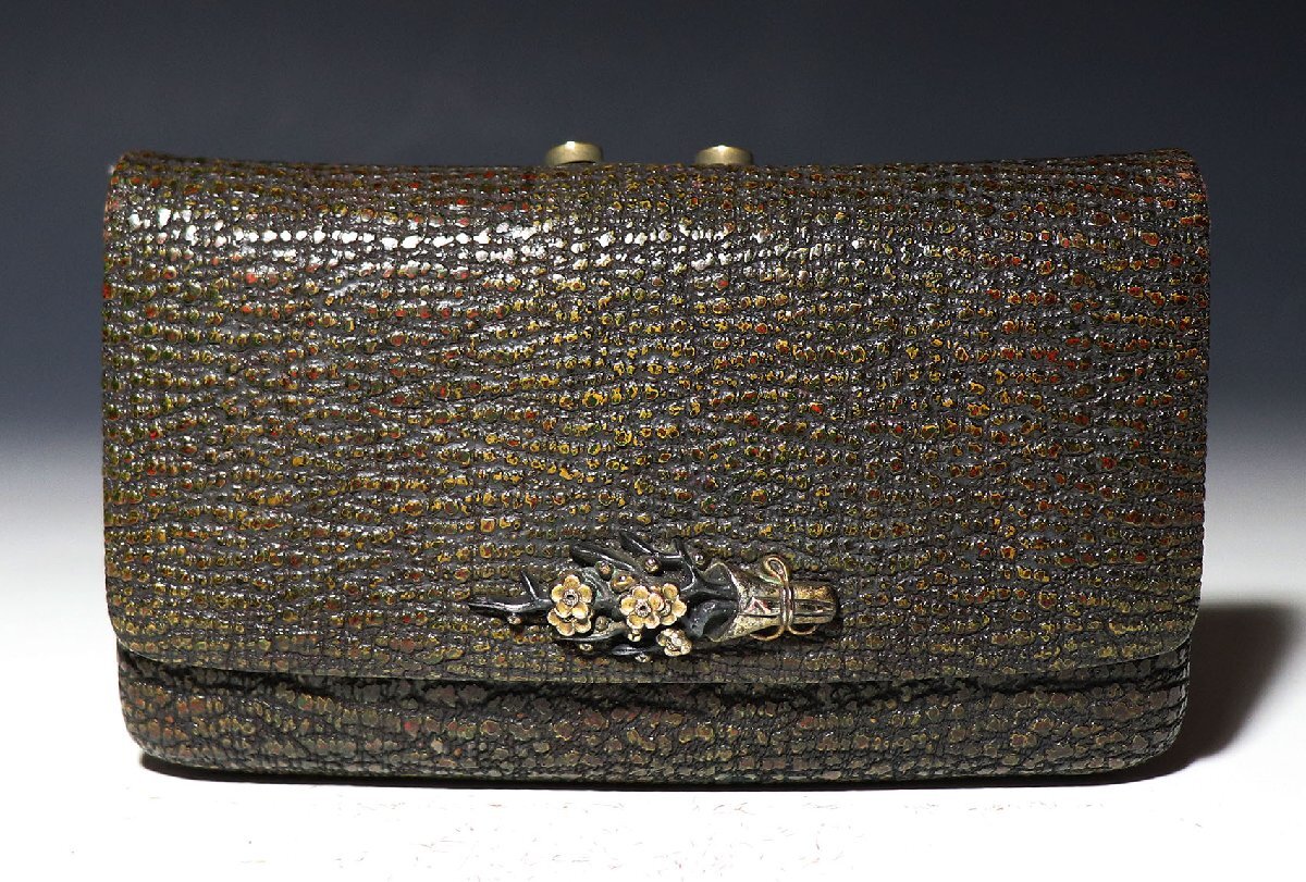 - 【桃】提げ物:金工四分一地金象嵌梅花図飾り金具革製煙草入れ