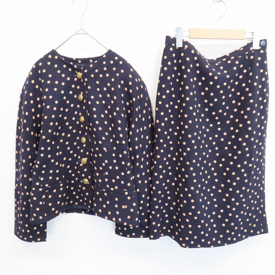 【ブランド】イエガー JAEGER 【アイテム】セットアップ スカートスーツ【表記サイズ】US10【平置き実寸】トップス裄丈:約 71cm着丈:約 56cm身幅:約 51cmボトムスウェスト:約 35.5cmスカート丈:約 66cmヒップ:約 51cm後ろスリット:約 19cm【状態】目立った傷汚れなし【備考】希少なグレートブリテン製【色】ブラック系【素材】画像をご参照ください。キーワード/アクイール/古着/used/ビンテージ/ヴィンテージ/昭和/レトロ/水玉/ノーカラー/大きいサイズ/made in Great Britain/