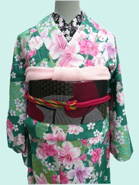 - 中古 洗える振袖 H.L アッシュエル 緑グリーンみどり 花柄 仕立て上がり 081桃 送料無料