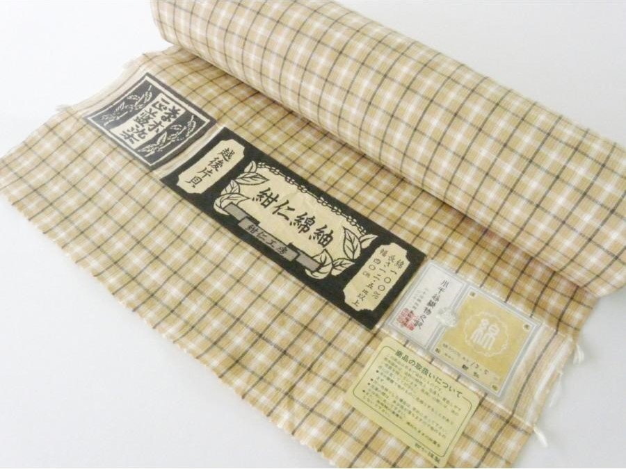 > 綿紬 反物 越後片貝 小千谷紬 草木染め 藍染 綿100% ベージュ系 チェック 114