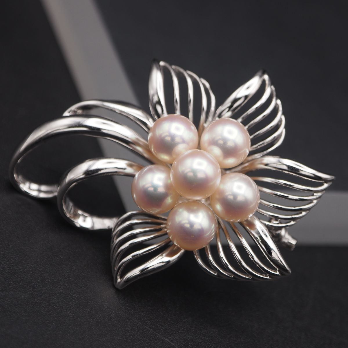 - G604 本真珠 6.9mm6珠 パール SILVER刻印 ブローチ フラワー デザイン シルバー コサージュ 6月誕生石
