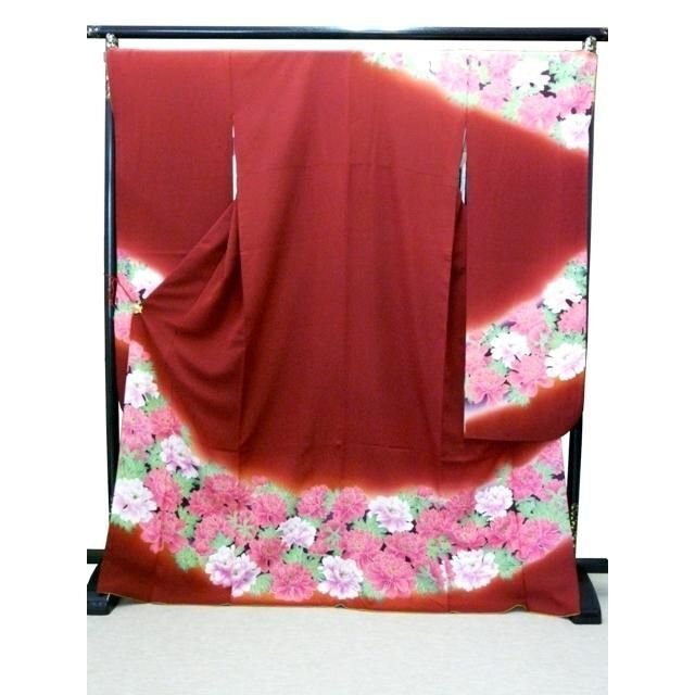 - 中古 振袖 正絹 試着品 赤茶レンガ色 ピンク白ボカシ大輪の牡丹 着丈171cm 裄70cm 仕立上り 025 送料無料