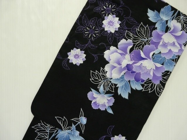 - 女性用ゆかた 単品 仕立上り 黒地に牡丹 花柄 ラメ付き フリーサイズ 新品 628