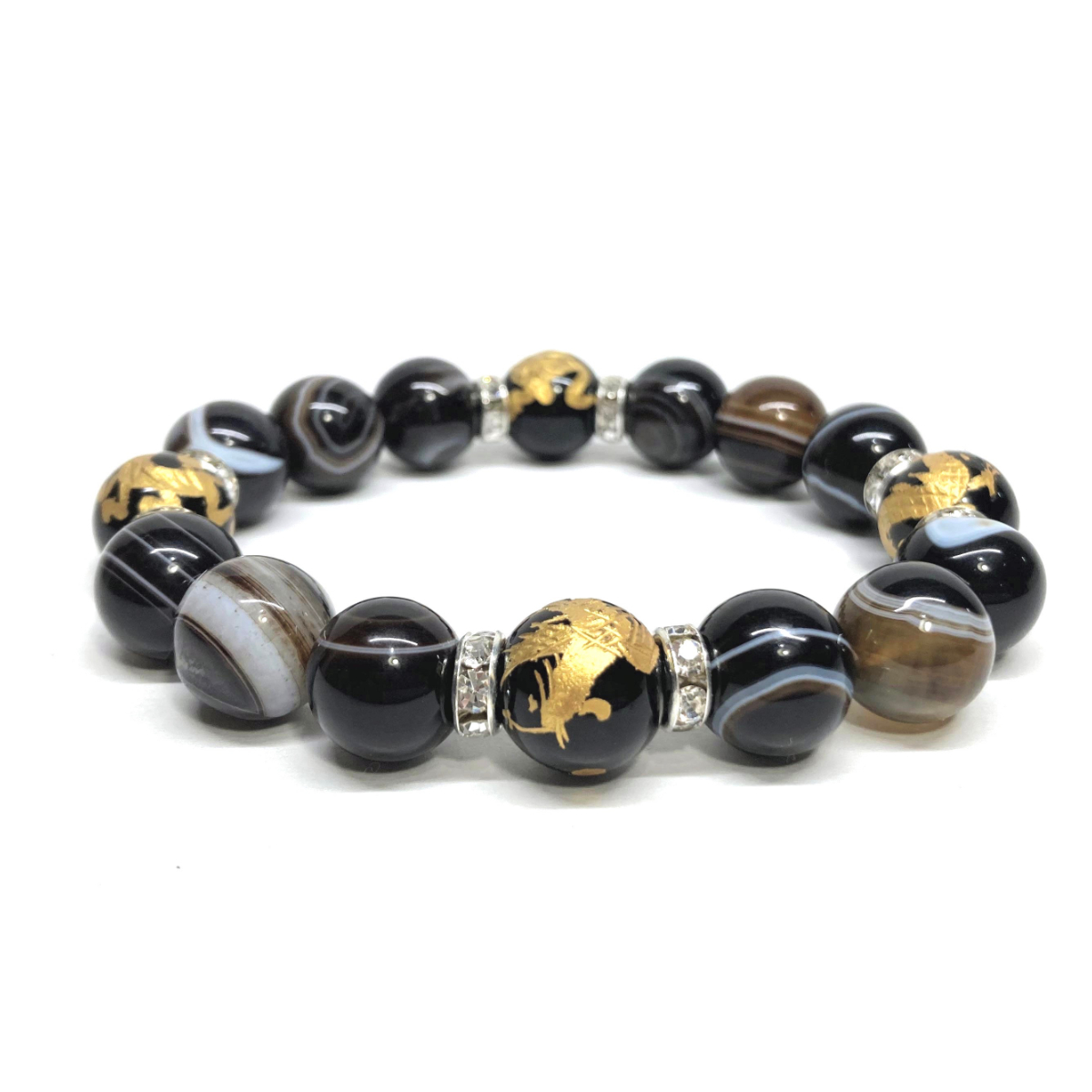 - 四神獣金彫オニキス×チベットアゲート(天眼石) 12mm パワーストーン ブレスレット天然石 青龍 白虎 玄武 朱雀 開運 金運 厄払 お守り S